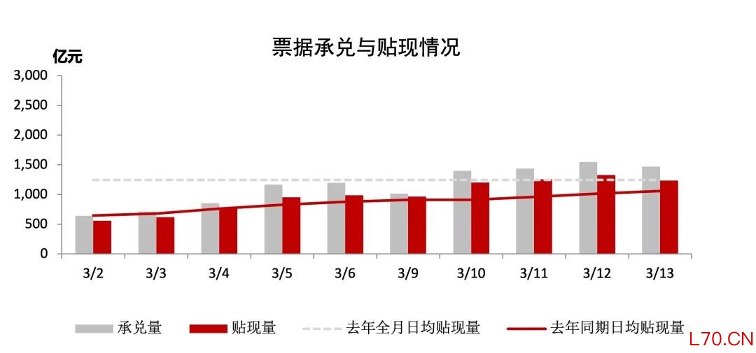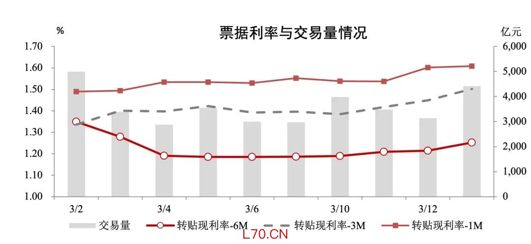 一级市场方面,本周日均承兑1376.47亿元,较上周环比增加50.18%;本周日均贴现1198.09亿元,较上周环比增加53.60%;承贴比87.04%,较上周增加1.94个百分点。3月票据市场到期量约2.77万亿元,需要全月日均约1260亿元贴现补到期。
