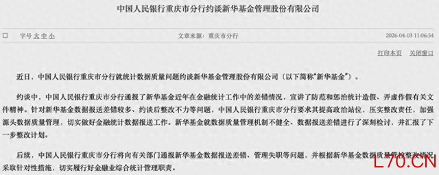 配资炒股4月3日,中国人民银行(简称“央行”)重庆市分行就统计数据质量问题约谈新华基金管理股份有限公司(简称“新华基金”)。