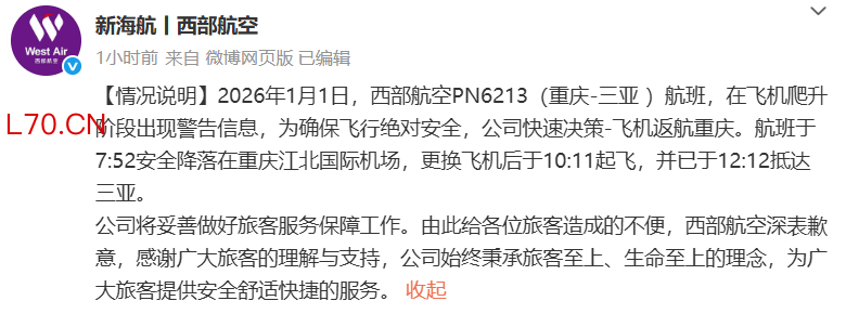 西部航空通报一客机紧急返航:飞机爬升阶段出现警告信息