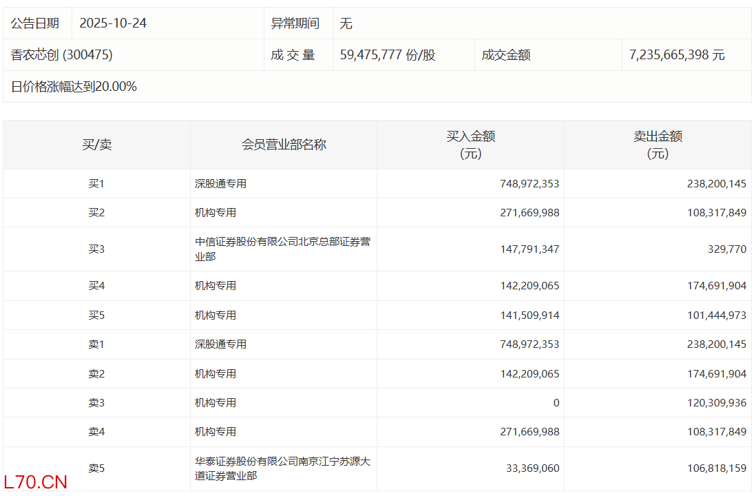香农芯创今日20%涨停,2家机构专用席位净买入2.03亿元