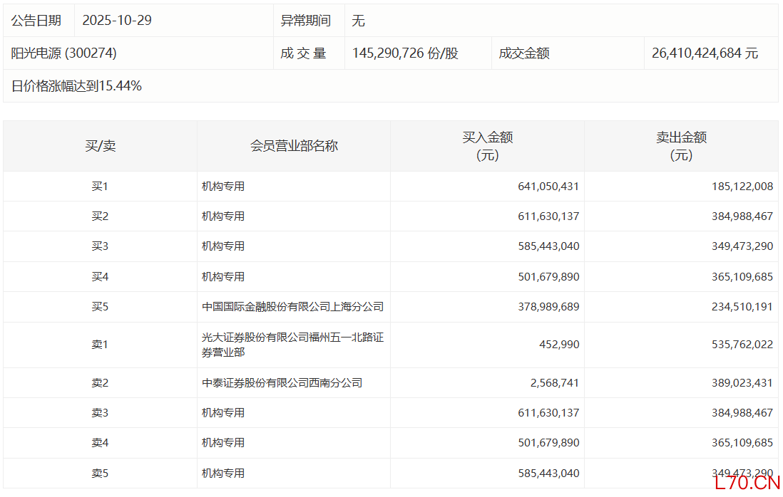 阳光电源今日涨15.44%,4家机构专用席位净买入10.55亿元