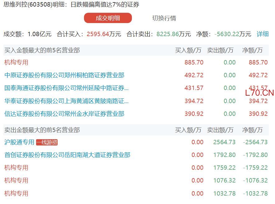 思维列控今日跌9.87%,有4家机构专用席位净卖出1.25亿元