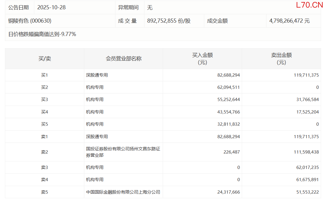 铜陵有色今日跌停,4家机构专用席位净买入1.44亿元