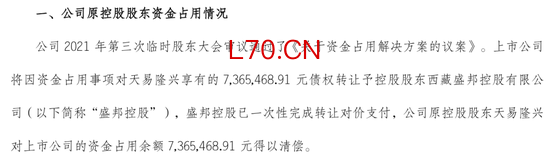 今年3月25日,公司公告称,2021年第三次临时股东大会审议通过了《关于资金占用解决方案的议案》。上市公司将因资金占用事项对天易隆兴享有的约740万元债权转让予控股股东西藏盛邦控股有限公司(以下简称“盛邦控股”),盛邦控股已一次性完成转让对价支付,公司原控股股东天易隆兴对上市公司的资金占用余额约740万元得以清偿。