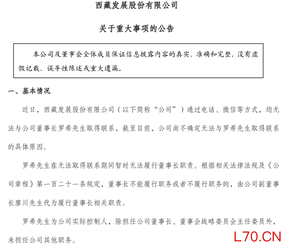 4月2日晚间,ST西发(维权)(000752)发布公告,近日公司无法与董事长罗希取得联系,导致其暂时无法履行董事长职责。