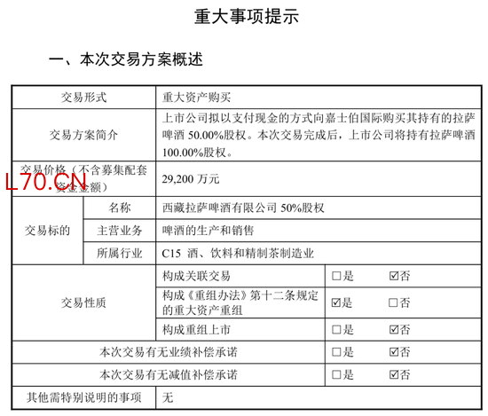 今年1月29日,ST西发公告称拟以现金2.92亿元收购嘉士伯持有的拉萨啤酒50%股权。