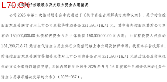 公司2025年第二次临时股东会审议通过了《关于资金占用解决方案的议案》,关于时任控股股东及关联方占用上市公司及拉萨啤酒资金3.31亿元,其中盛邦控股以其对公司享有的1.50亿元债权代资金占用主体抵偿1.50亿元占用;由重整投资人代偿的1.81亿元资金代资金占用主体已分别偿还给上市公司及拉萨啤酒。截至本公告披露日,时任控股股东及关联方等相关主体对上市公司的资金占用3.31亿元通过现金及债权抵偿的方式全部得以清偿完毕。
