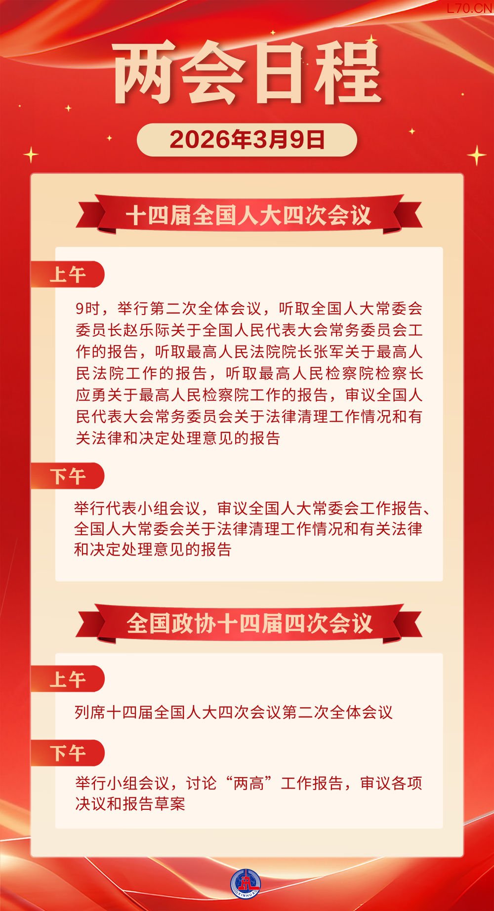 两会日程预告|3月9日:全国人代会举行第二次全体会议 听取全国人大常委会工作报告和“两高”工作报告
