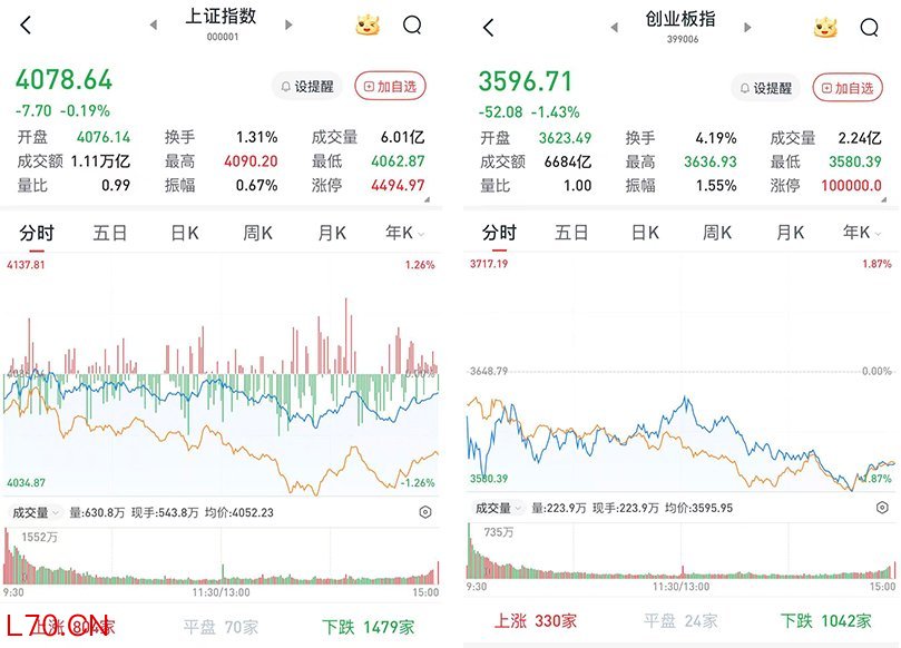 至收盘,上证综指跌0.19%,报4078.64点;深证成指跌1.1%,报14830.46点;创业板指跌1.43%,报3596.71点。